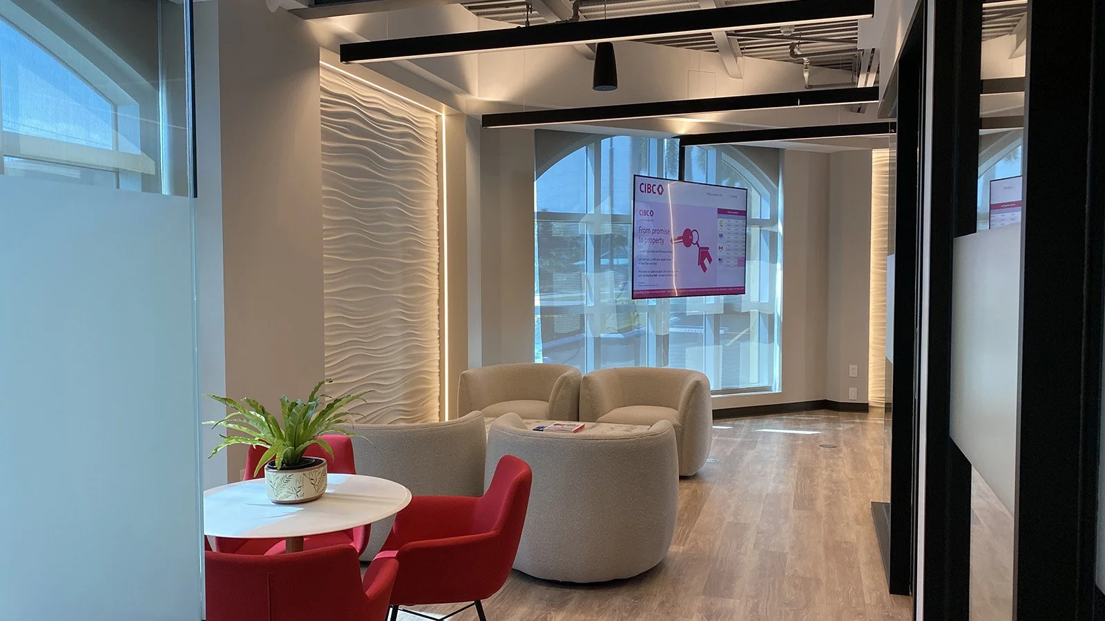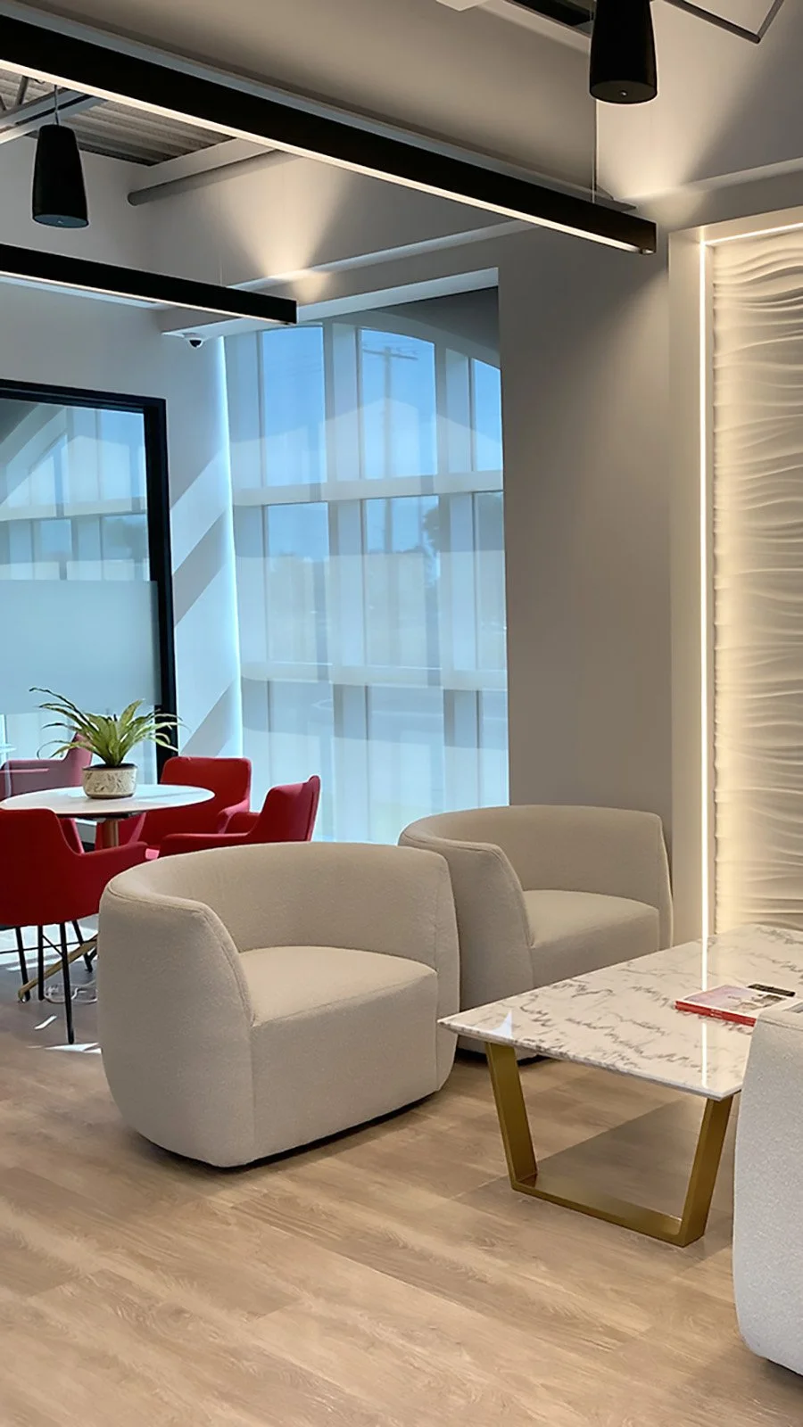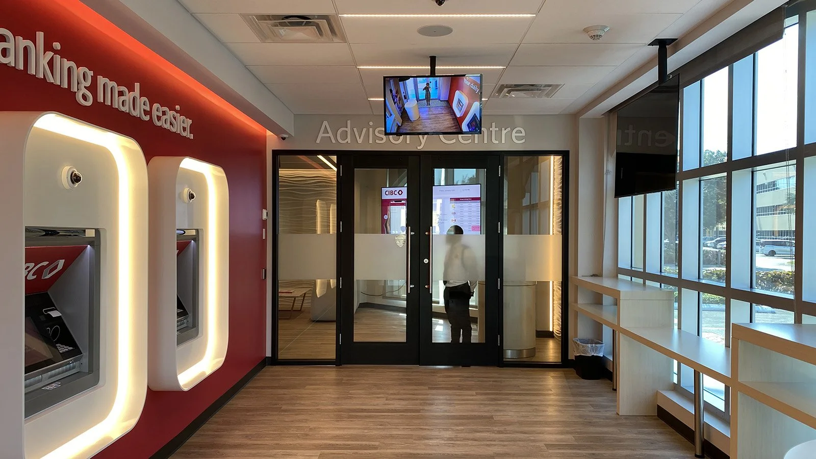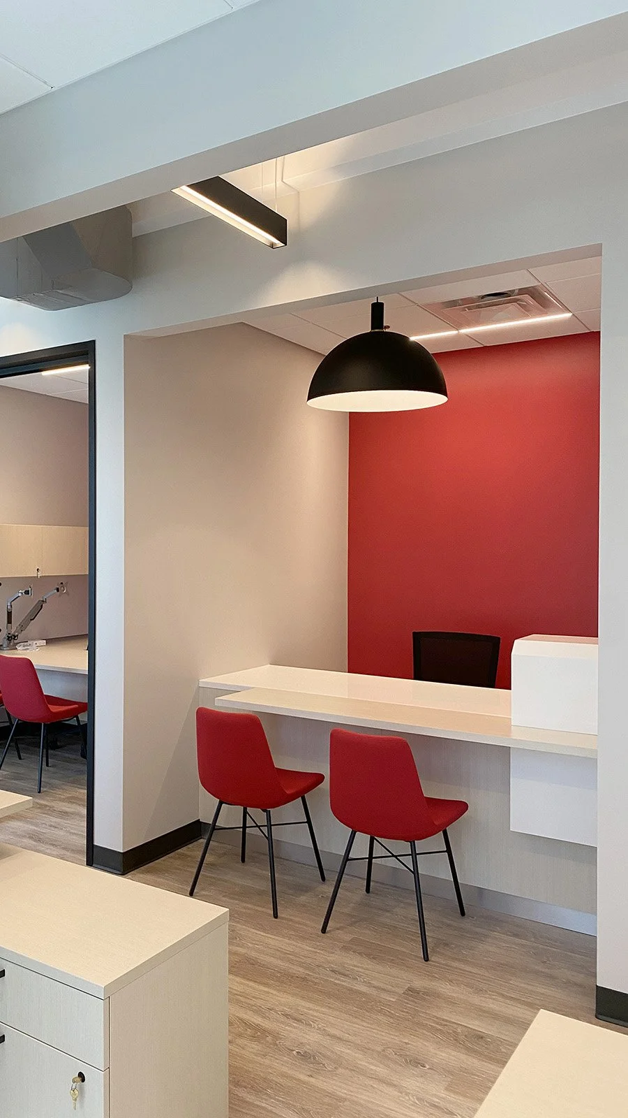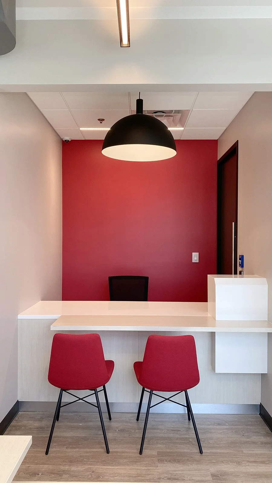 Conceived as CIBC Caribbean’s “branch of the future,” the Platinum Centre reimagines the customer journey around a sculpted ABM lobby. In this inviting, technology-forward space, most transactions begin and end. Brand-red walls and halo-lit portals signal clarity and speed, while the remainder of the branch shifts to a warmer register: Contemporary offices and meeting suites with clean lines, wave-textured wall panels recalling the sea, and finely tuned lighting.