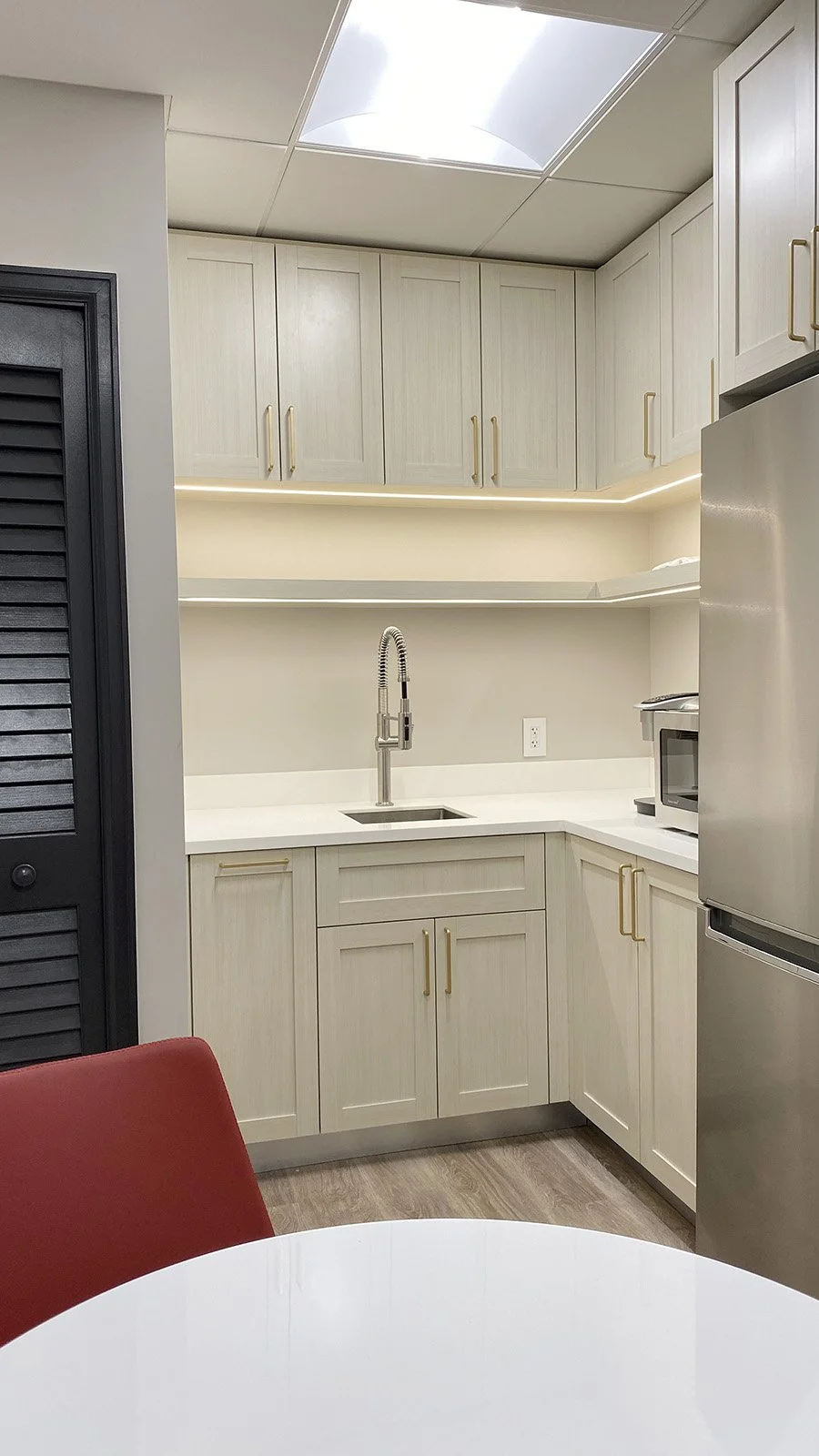 Designed for a family office that values privacy and hospitality equally, this 750 sq ft suite balances warmth with precision. The layout arranges an executive desk and a glass-fronted meeting room around a central collaboration table, allowing the space to transition smoothly from focused work to client meetings.