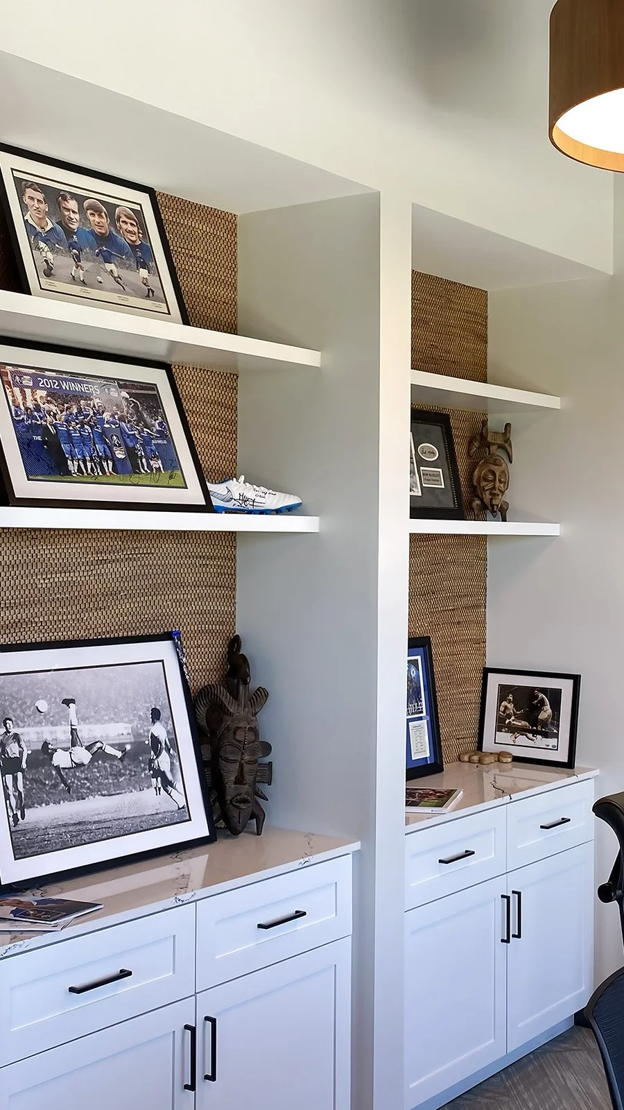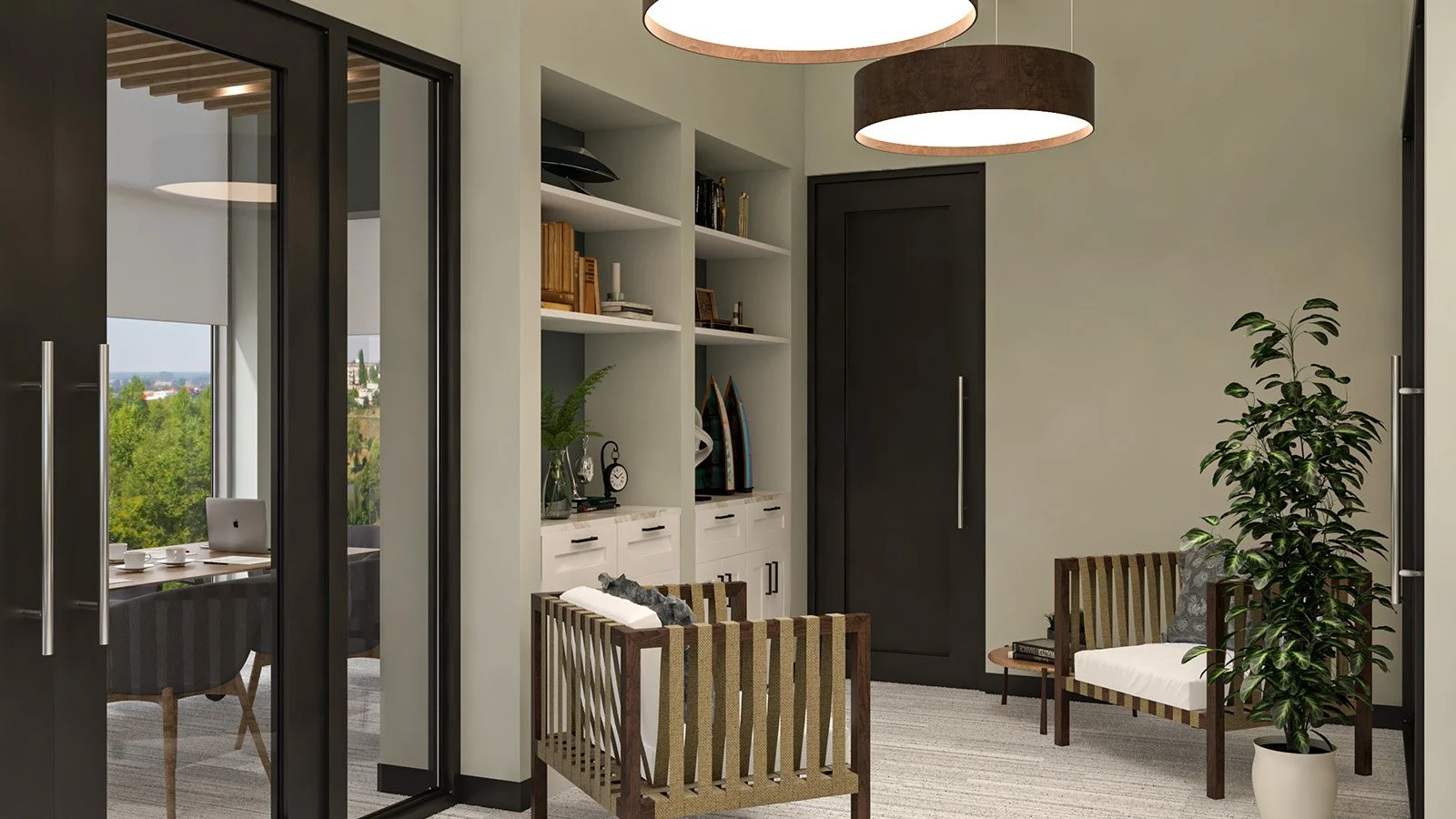 A grounded palette—soft sage, warm wood, matte black framing, and textured upholstery—keeps the tone professional yet inviting. Drum pendants and layered task lighting provide even illumination and acoustic softness; roller shades and glazing control daylight and privacy. Built-in storage conceals equipment and paperwork, while in-table power and AV facilitate a clean, high-tech workspace. The result is a small office that feels expansive: calm, functional, and unmistakably Cayman.
